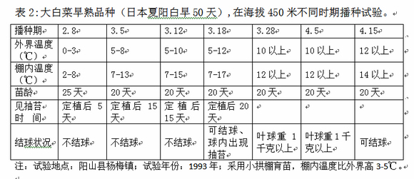 2.高海拔山区:海拔高度在300米以上地方,可进行夏季反季节栽培。采用耐热早熟的品种。根据试验结果,大白菜早熟品种必须在温度稳定在13℃以上才可播种,否则会发生早期抽苔,降低产量或完全丧失商品价值。不同低温,对抽苔迟、早也有影响,见表2。